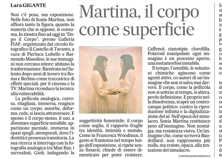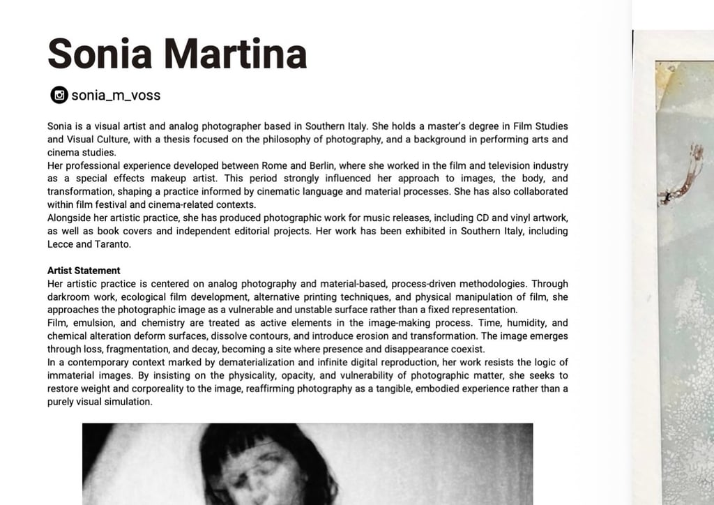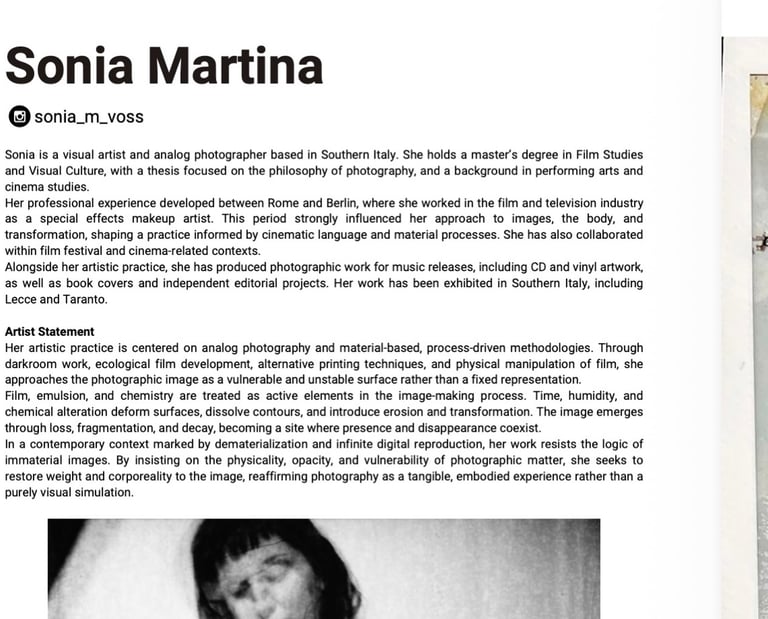 Sonia Martina è un’artista visiva e fotografa analogica sperimentale che vive e lavora nel Salento. Dopo anni trascorsi tra Roma e Berlino come truccatrice di effetti speciali per il cinema e la televisione, ha orientato la propria ricerca verso la fotografia, intesa come pratica materiale e processo di trasformazione. Lavora con pellicola e Polaroid, attraverso doppie esposizioni, sperimentazione in camera oscura, sviluppo ecologico al caffenol e tecniche di manipolazione e degrado dell’immagine, tra cui bagni alteranti, shock termici e interventi sull’emulsione.